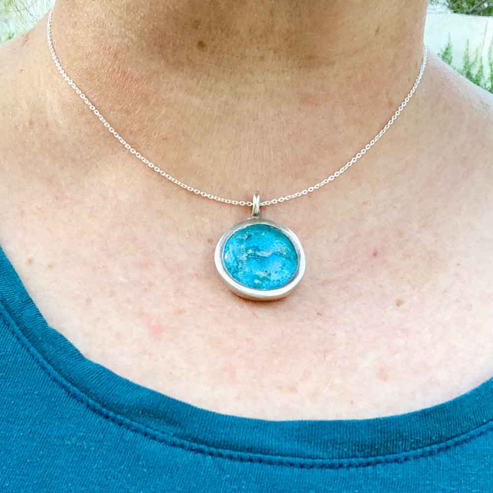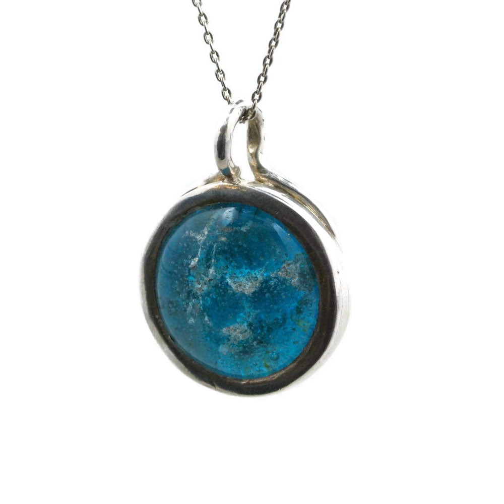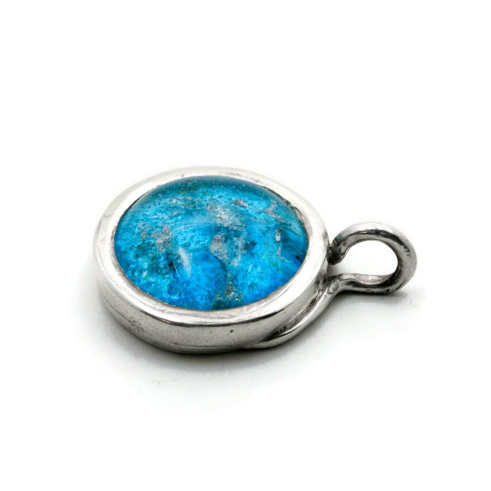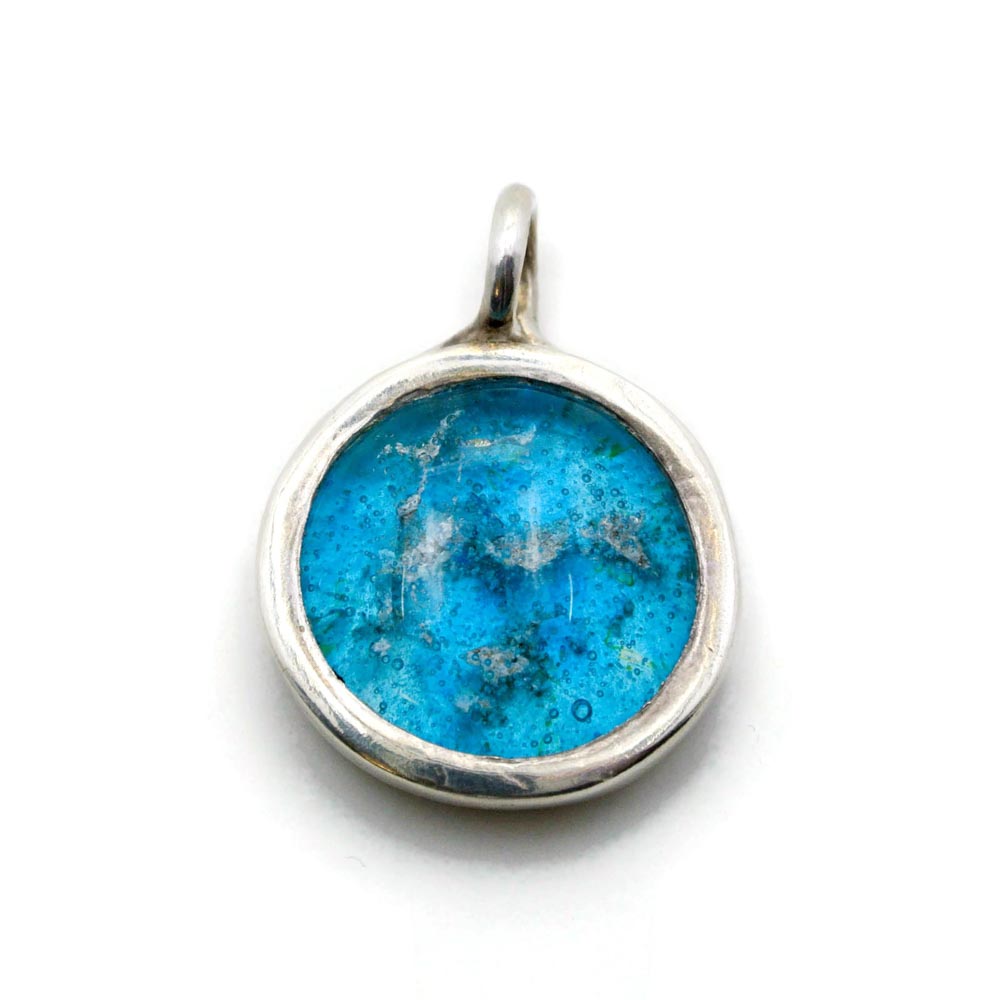 This cremation ash pendant has a thick silver bezel framing the glass which makes it a solid and heavier pendant. This pendant also has a looped bail on top that make it look unique.