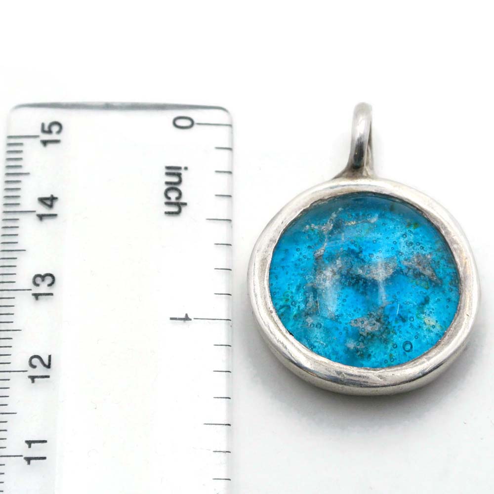 The glass is approximately 3/4" in diameter (20 mm). This pendant is approximately 1 3/8 inches tall (35 mm) including the bail, and 1 inches (27 mm) wide. The pendant is approximately 3/8" in depth at the glass cabochon (see side view photo). This pendant comes on a 18 inch sterling silver chain.